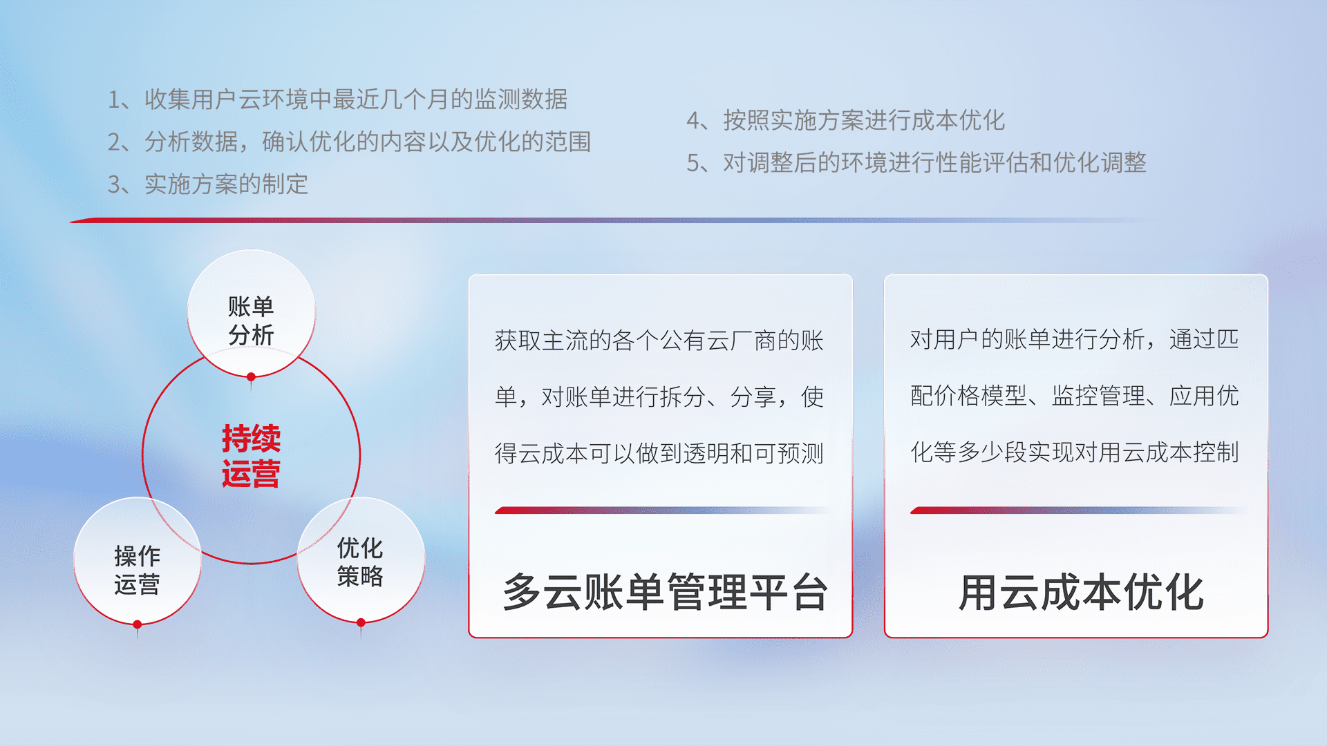 通过多云纳管,,,,以统一的资源数据模型把客户的云资源进行抽象和封装,,,,进而实现对多云资源的统一操作,,保障云资源管理的可靠性、、、稳定性与可用性。。。量身定制化运维内容,,配置、、、开发运维、、补丁管理、、、备份、、监控、、、、认证和访问管理、、审计和日常巡检等,,,保障在用云过程中的可靠度,,,,稳定度以及高可用率。。。。